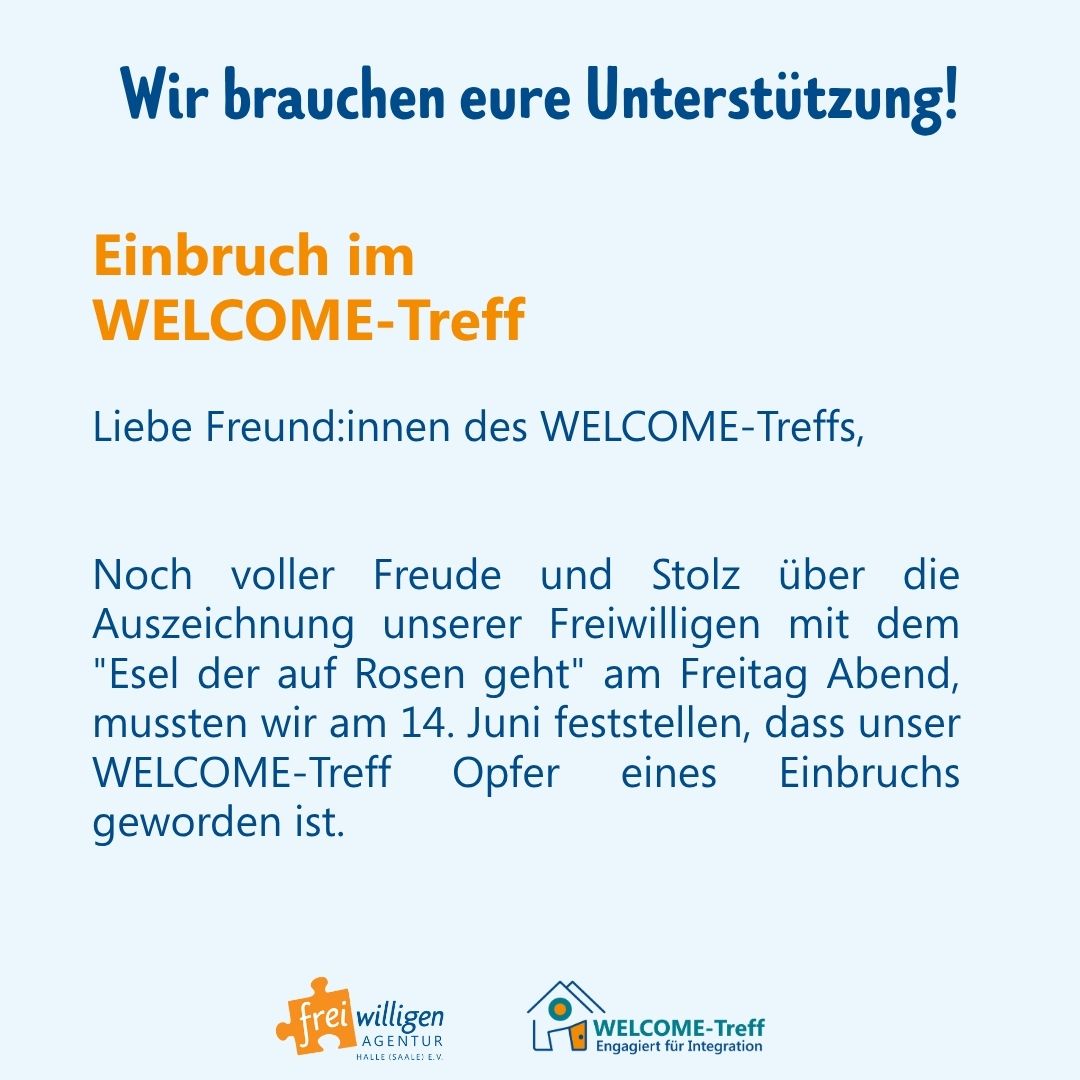 Noch voller Freude und Stolz über die Auszeichnung unserer Freiwilligen mit dem „Esel der auf Rosen geht“ am Freitag Abend, mussten wir am Wochenende feststellen, dass unser WELCOME-Treff Opfer eines Einbruchs geworden ist.
